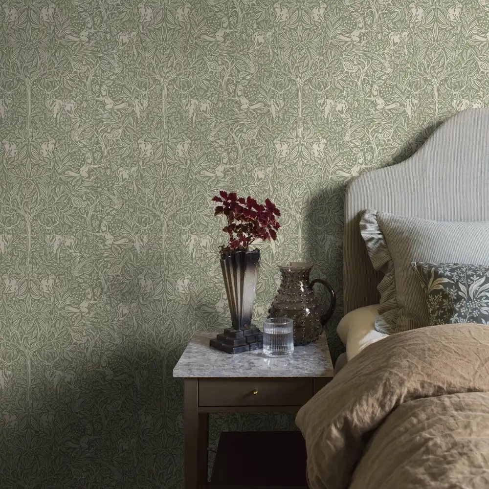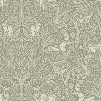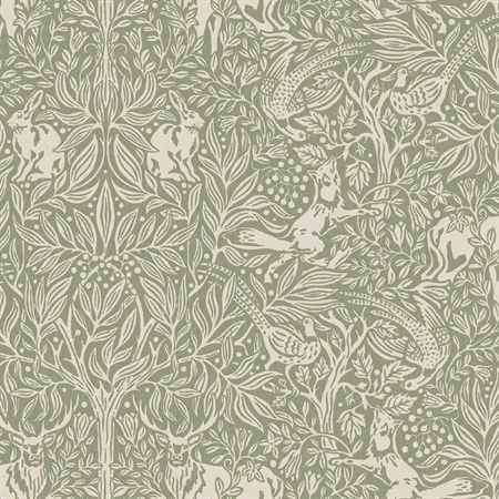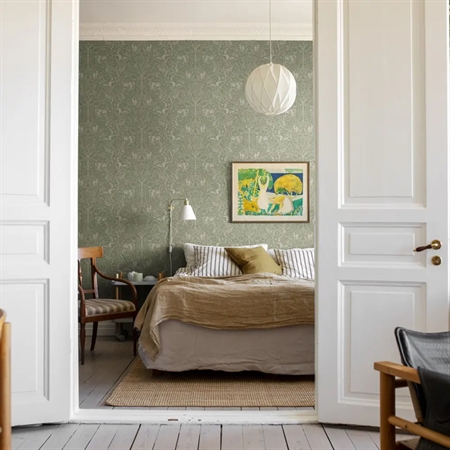 Under the Elder Tree er et let og stemningsfuldt tapet med et fortællende motiv, holdt i friske nuancer af salviegrøn og beige. I centrum står det smukke træ, der breder sin krone ud og giver skygge og ly til skovens dyr. Her møder man både hare, ræv, hjort og fasaner, hver især en del af den stille fortælling, som folder sig ud over væggen.