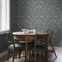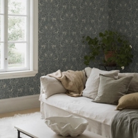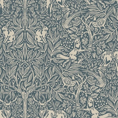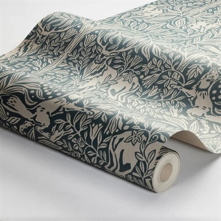 Under the Elder Tree er et stemningsfuldt og detaljerigt tapet med et fortællende motiv, hvor naturens liv udspiller sig under det mægtige elmetræ. Farvesætningen er holdt i kontrasterende nuancer af mørk stål, petrolblå og beige, som giver mønstret både dybde og en rolig, sofistikeret tyngde. I scenen ses den stolte hjort og den sky hare i skyggen af træet, mens ræven bevæger sig gennem landskabet, og fasaner søger tilflugt i hvidtjørnebusken.