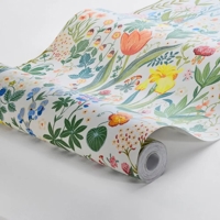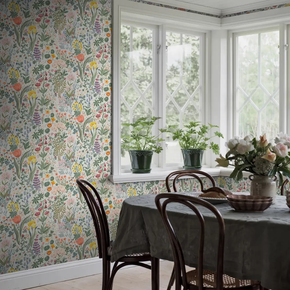Udtrykket er detaljerigt, men stadig luftigt og afbalanceret, så tapetet fremstår både levende og harmonisk. Den klare, flerfarvede palet giver rummet friskhed og mulighed for at lege med både farver og materialer i indretningen, uden at helheden mister sin ro.