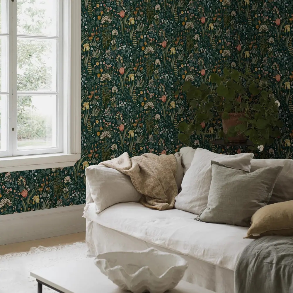 Blomsterhav passer smukt i stue, spisestue eller soveværelse, hvor det kan bruges både som fokusvæg og på alle vægge for at skabe en omsluttende og stemningsfuld atmosfære.