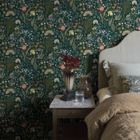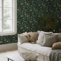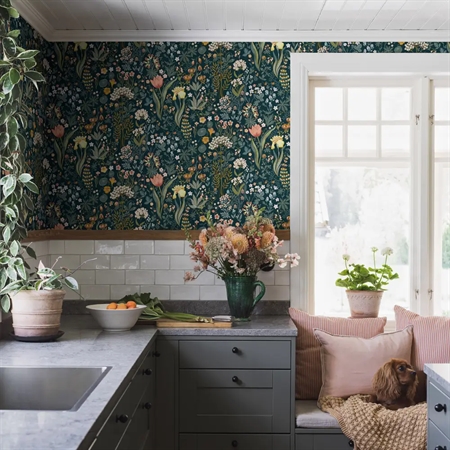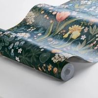 Blomsterhav er et rigt og stemningsfuldt tapet designet af Noomi Spange, hvor et frodigt blomstermotiv folder sig ud mod en dyb, petrolblå bund. Mønstret leder tankerne hen på en lille blomstrende lysning midt i skovens ro, hvor farver og former samles i en levende, men velafbalanceret helhed.