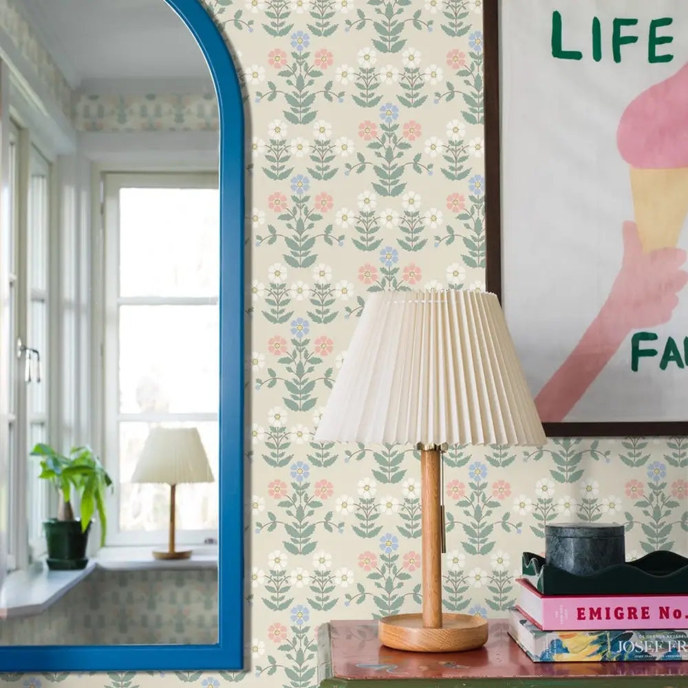 Her ses Sippor i en lys og varm pastelpalette med creme, lyserød, blå og hvid. Et stemningsfuldt tapet, der passer smukt i soveværelset, køkkenet eller hjemmekontoret, hvor du ønsker et moderne, hyggeligt og personligt udtryk.