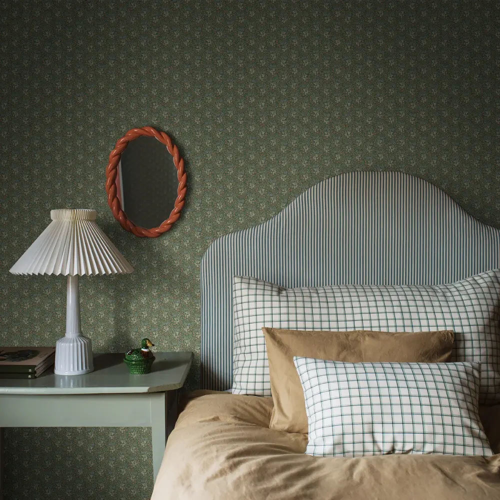 Bella er et stemningsfuldt blomstertapet med et småblomstret mønster, der giver en frisk og nutidig fortolkning af et klassisk udtryk. Motivet er trykt med traditionel collagraph-teknik, som tilfører overfladen dybde og en let håndværkspræget karakter. Udtrykket leder tankerne hen på solrige dage i blomstrende haver og skaber en rolig, indbydende stemning i rummet.