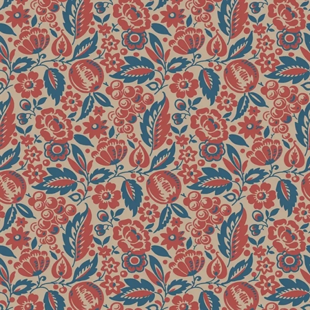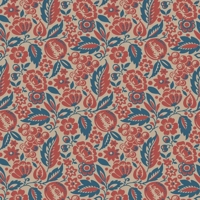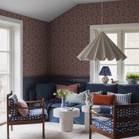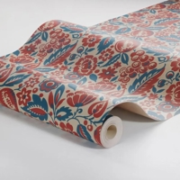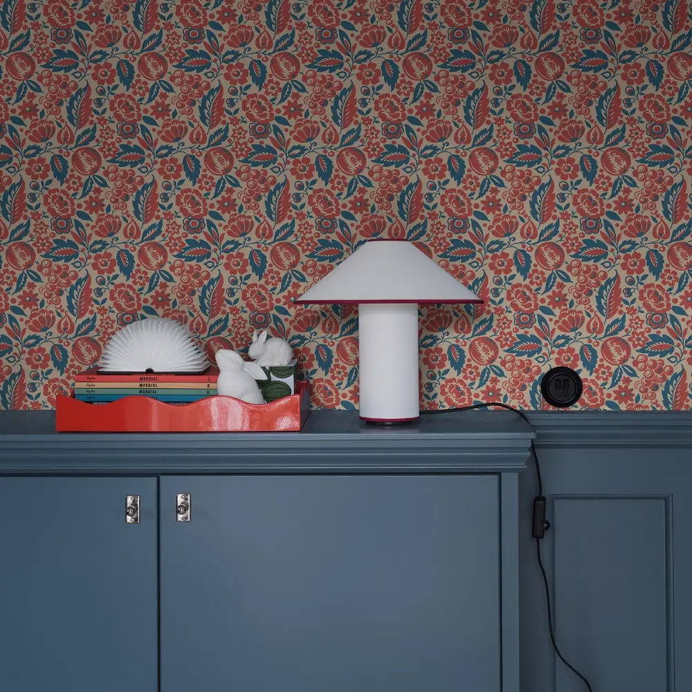 Her ses Elise i en klassisk farveskala med kraftig rød og dyb blå. Et tapet, der fungerer lige så godt som markant fokusvæg som på alle fire vægge i køkkenet, spisestuen eller soveværelset, hvor du ønsker et rigt og indbydende udtryk.