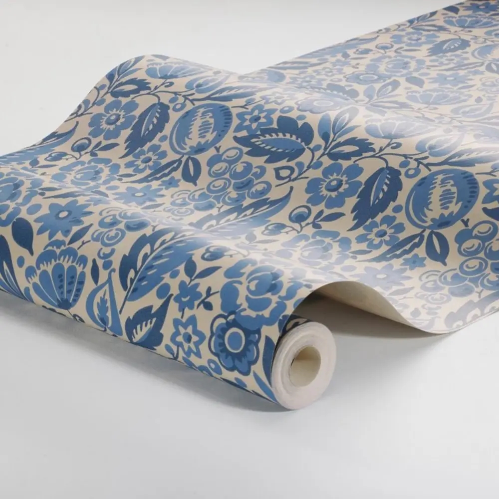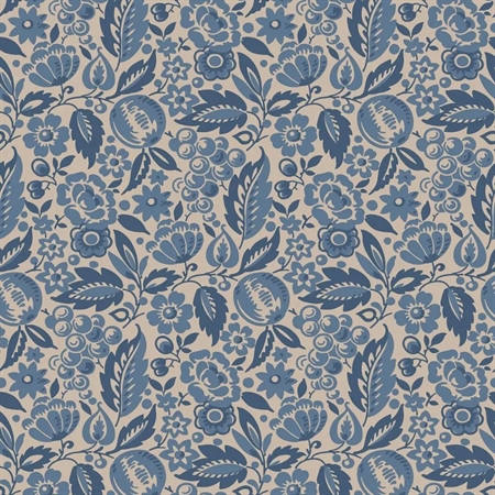Elise er et roligt og stemningsfuldt tapet med et tæt, folkeinspireret mønster af blomster, løv, æbler og bær. Designet stammer fra begyndelsen af 1900-tallet og er trykt med traditionel collagraph-teknik, som giver overfladen dybde og et smukt, håndværkspræget udtryk. Kombinationen af det rustikke mønster og den afstemte farveholdning gør tapetet både klassisk og nutidigt.