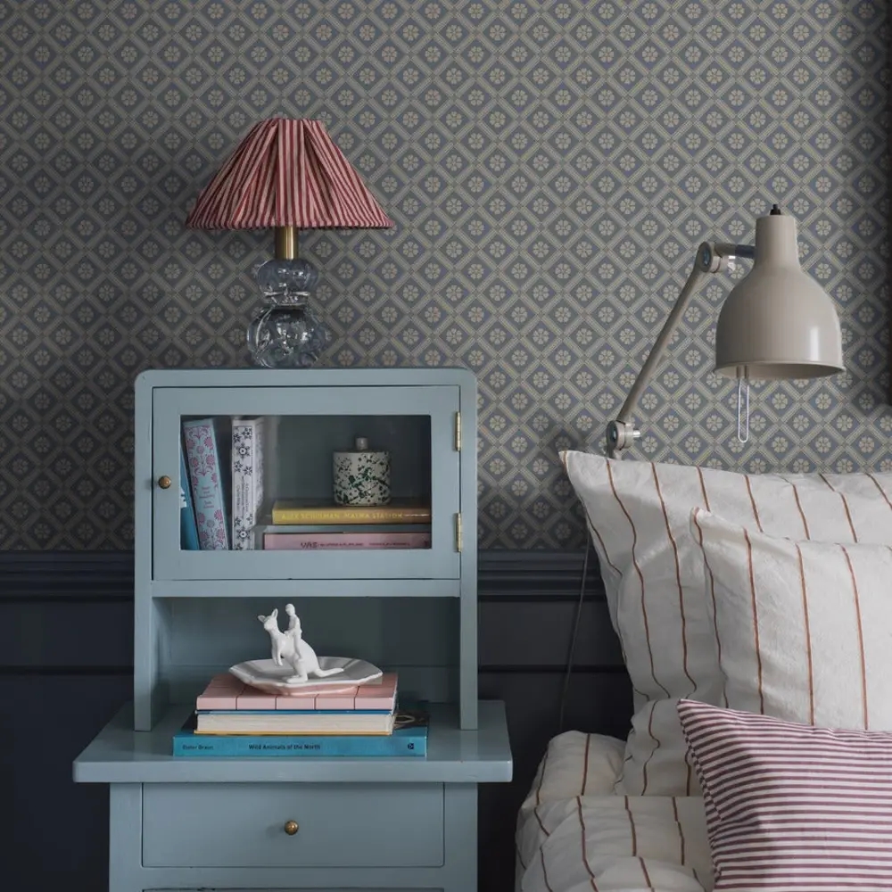Her ses Love i en luksuriøs farvesammensætning med dyb blå kombineret med pergamentbeige. Et karakterfuldt tapet, der fungerer lige så godt som markant accentvæg som på alle fire vægge i gang, spisestue eller køkken.