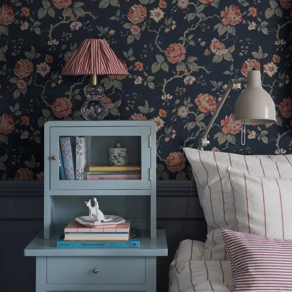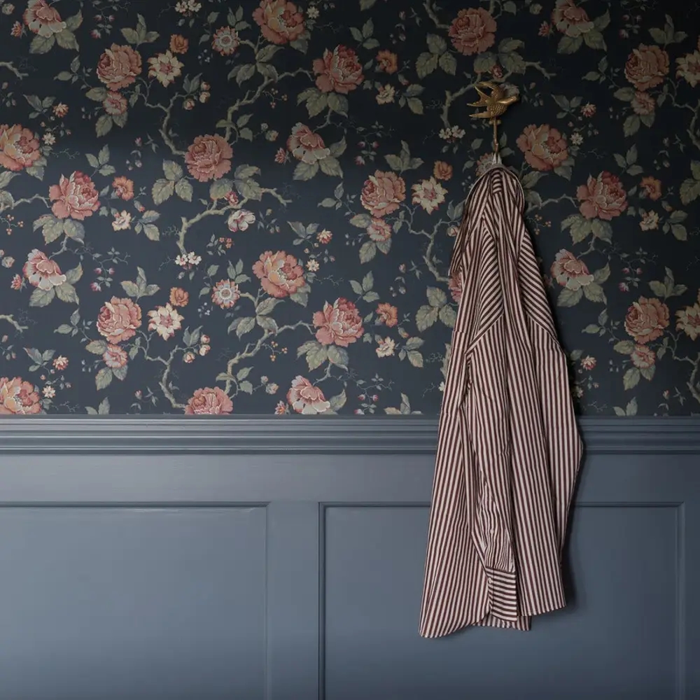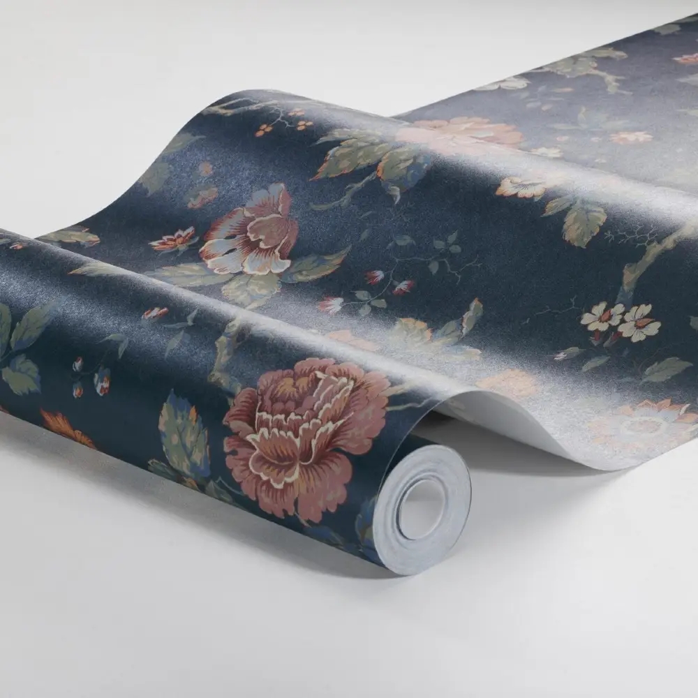 De snoede rosenkviste breder sig i et tæt, men afbalanceret mønster med blomster i nuancer af fløde, varm grøn, blå, orange, rusten rød og burgunder. Den mørkeblå bund giver dybde og ro, mens den let patinerede, smalle stribestruktur i baggrunden tilfører tapetet en diskret tekstil fornemmelse og et forfinet, historisk præg.