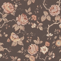 Farvepaletten holdes i varme brune nuancer med fine indslag af beige, creme, burgunder og rust rød. Den patinerede baggrund med diskrete, smalle striber tilfører tapetet en let tekstil fornemmelse og understreger dets klassiske og tidløse udtryk.