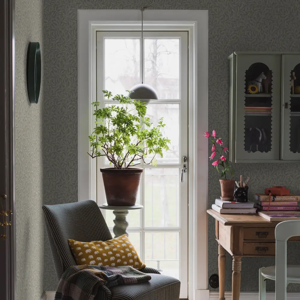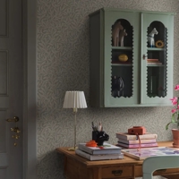 Vintergröna er et dekorativt tapet med et tæt og levende bladmønster, der tydeligt trækker tråde til Arts and Crafts-bevægelsens sans for natur, håndværk og ornamentik. Udtrykket er rigt, men afbalanceret, og skaber en rolig helhed, hvor mønstret får lov at omslutte rummet uden at virke tungt.