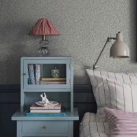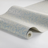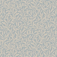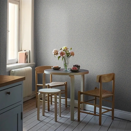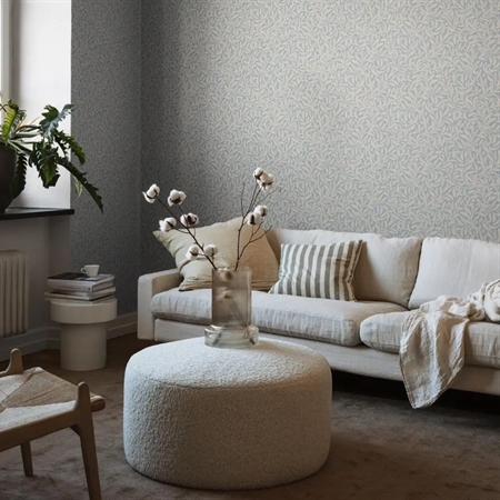 Farvesætningen holdes i pudderblå og linnedbeige, fint suppleret af diskrete accenter i grå og brun. Den afdæmpede palet giver tapetet et let og elegant præg, som passer smukt ind i både klassiske og mere enkle rum.