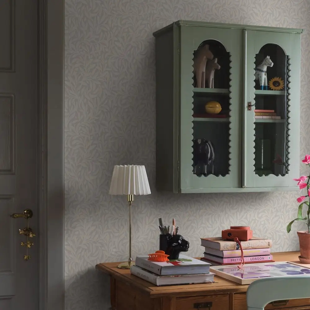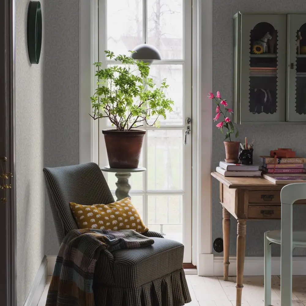 Vintergröna er et roligt og elegant tapet med et tæt, men let og afbalanceret bladmønster, tydeligt inspireret af Arts and Crafts-bevægelsens klassiske formsprog. Udtrykket er underspillet og harmonisk, og mønstret skaber en omsluttende stemning, der giver rummet en behagelig og afslappet karakter.