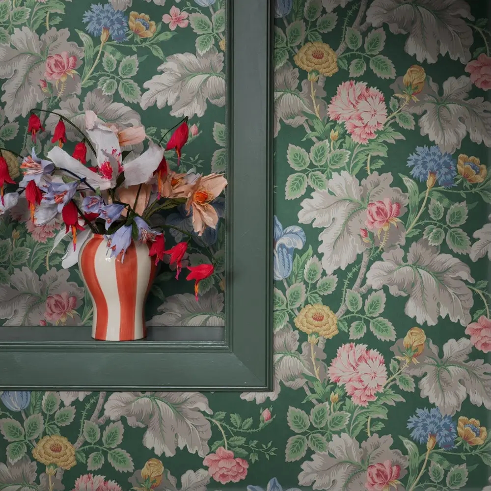 Carnation Garden er et rigt og dekorativt tapet med et detaljerigt blomstermotiv, hvor roser, nelliker og tulipaner breder sig i et levende, men harmonisk udtryk. Mønstret er sirligt illustreret og samler både klassiske og romantiske referencer i en helhed, der føles både tidløs og let nutidig.