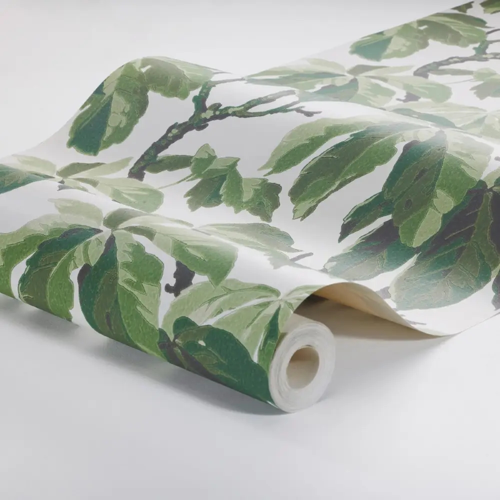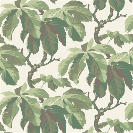Farvesætningen holdes i en naturlig palet af grønne nuancer på en blød, bleggul bund. Kombinationen giver tapetet et let og varmt udtryk, som bringer naturens ro og rytme ind i rummet uden at dominere.