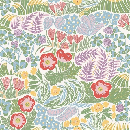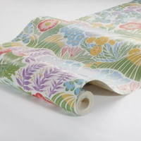 Rabatt er et let og levende tapet med et blomstrende mønster, inspireret af et sommerblomsterbed i fuldt flor. Motivet er skabt i collagraph-teknik og viser et rigt samspil af blomster som forglemmigej, primula og andre forårs- og sommerblomster, der breder sig i bløde, bølgende formationer over væggen.