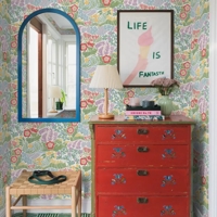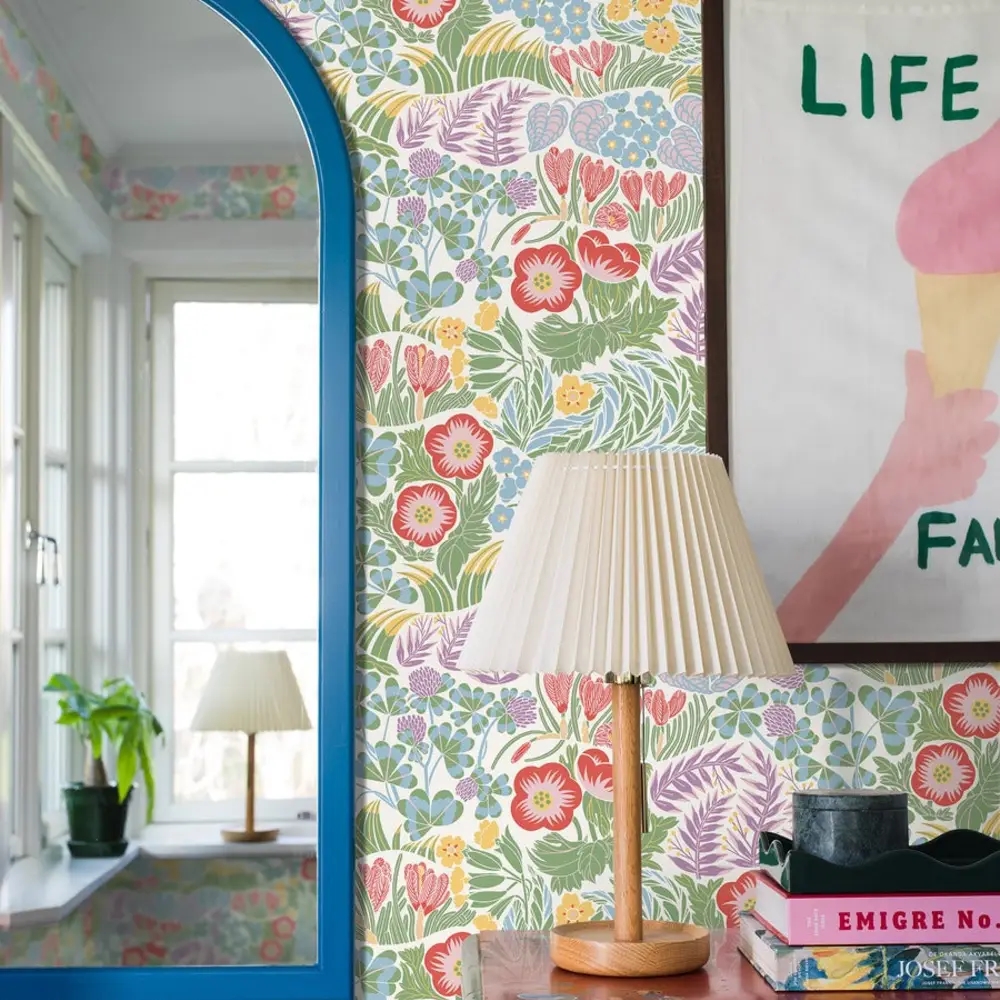 Farvesætningen er lys og harmonisk med nuancer af rød, lyserød, lilla, grøn, gul og lyseblå på en frisk hvid bund. Helheden føles let og indbydende og tilfører rummet en rolig glæde og en naturlig lethed.