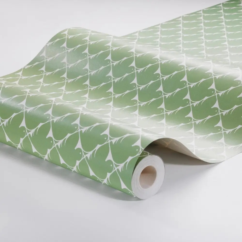 Farvesætningen holdes i en frisk grøn nuance på en ren, hvid bund. Kombinationen giver tapetet et let og moderne udtryk med et tydeligt nik til klassisk, grafisk mønstertradition.
