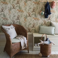 Her er Wild Forest trykt i jordbrune og rødbrune nuancer med grønne accenter på en lys linnedfarvet bund. Et varmt og indbydende valg til soveværelset, legerummet eller det kreative hjørne.