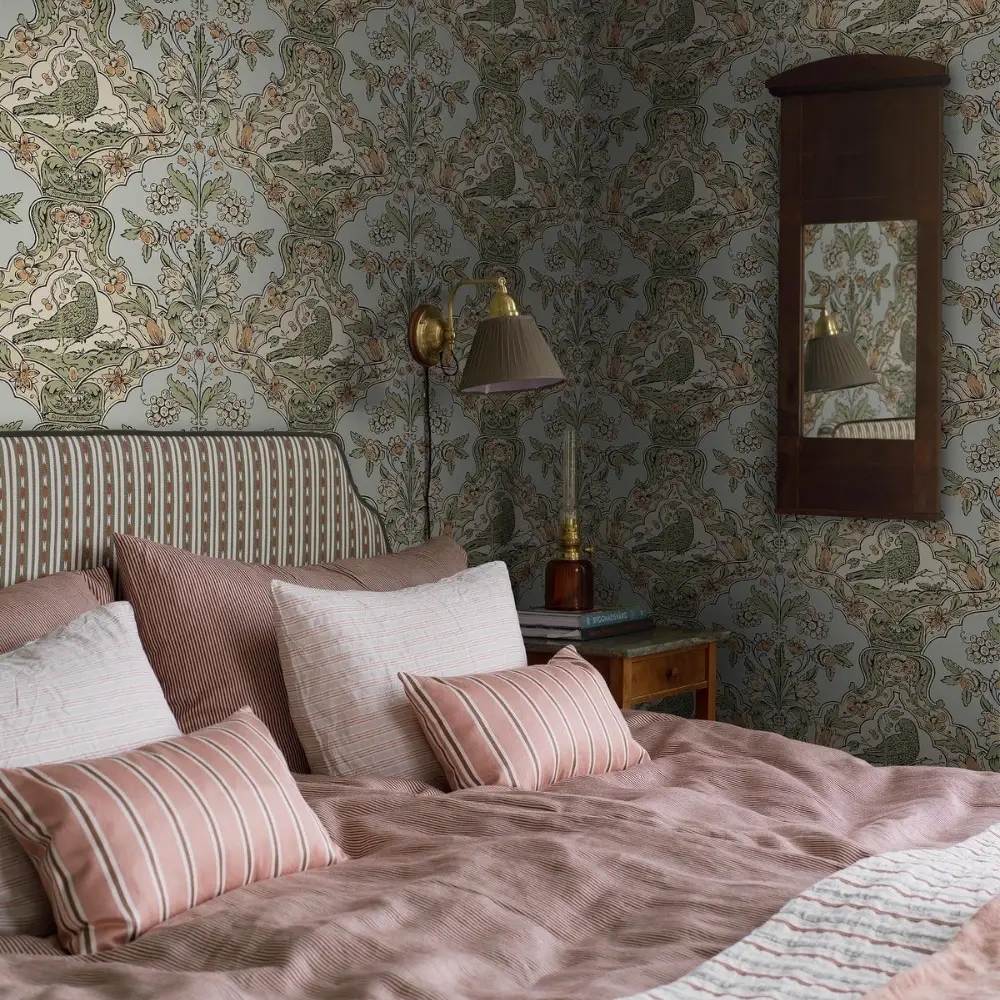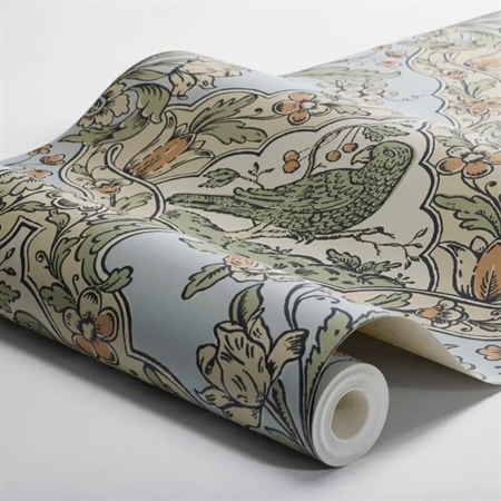 Skenninge er et storslået historisk tapet fra 1700-tallet, hvor fugle, druer, kirsebær og blomster udfolder sig i et rigt og detaljeret mønster. Originalen bærer teksten Skenninge Fabrique og regnes som det ældst bevarede svenskproducerede papirtapet i Nordisk Museums samlinger – et unikt stykke svensk tapethistorie.