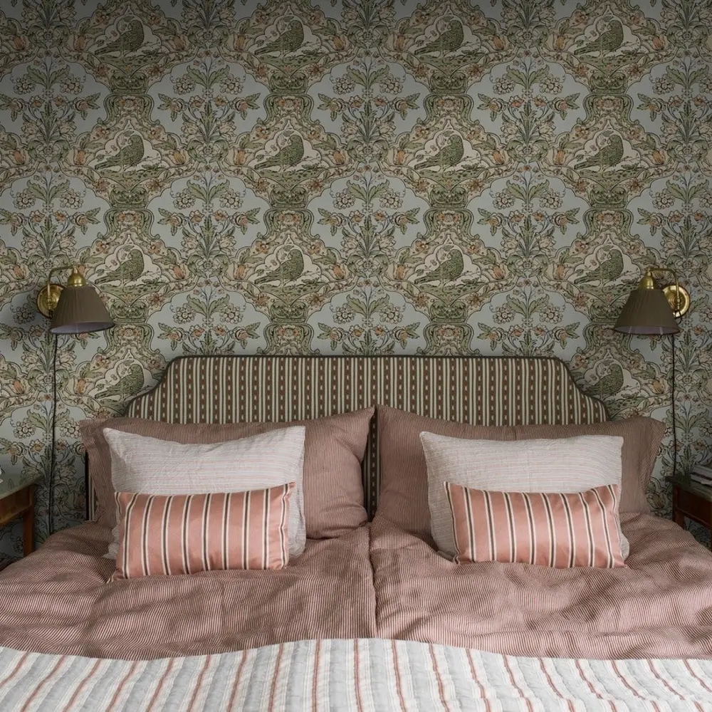 I denne nyfortolkning er Skenninge holdt i milde nuancer af grøn, rustrød og dæmpet honninggul på en varm lyseblå bund. Et stemningsfuldt tapet, der bringer historien ind i hjemmet med et roligt, elegant udtryk.