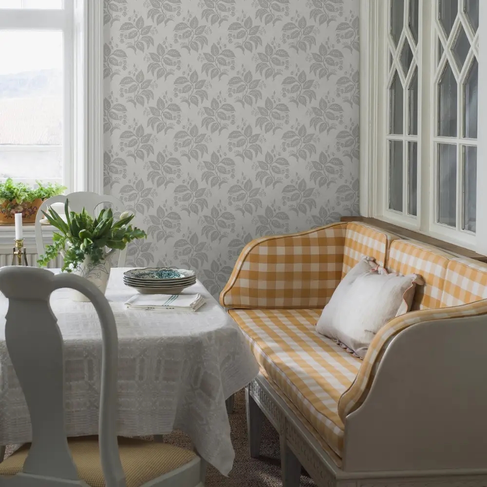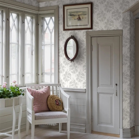 Her ses Tengbergska i en lys og frisk farvekombination med varme grå nuancer på en hvid bund – et elegant og klassisk udtryk, der giver rummet en fornemmelse af historisk håndværk og tidløs skønhed.