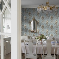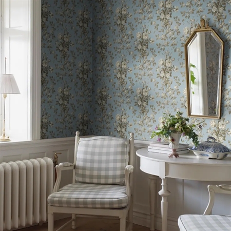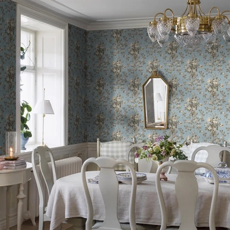 Tullgarn er et storblomstret tapet med anemoner og hvidtjørn samlet i smukke buketter bundet med silkebånd. Mønsteret stammer fra slottet Tullgarn, hvor det prydede Tjenerens værelse. Originalen kommer fra Sydtyskland og er sandsynligvis designet i 1880’erne. I dag genoptrykkes tapetet på Boråstapeters over 100 år gamle limtrykmaskine, som giver det samme levende og autentiske udtryk som den historiske forlægning.