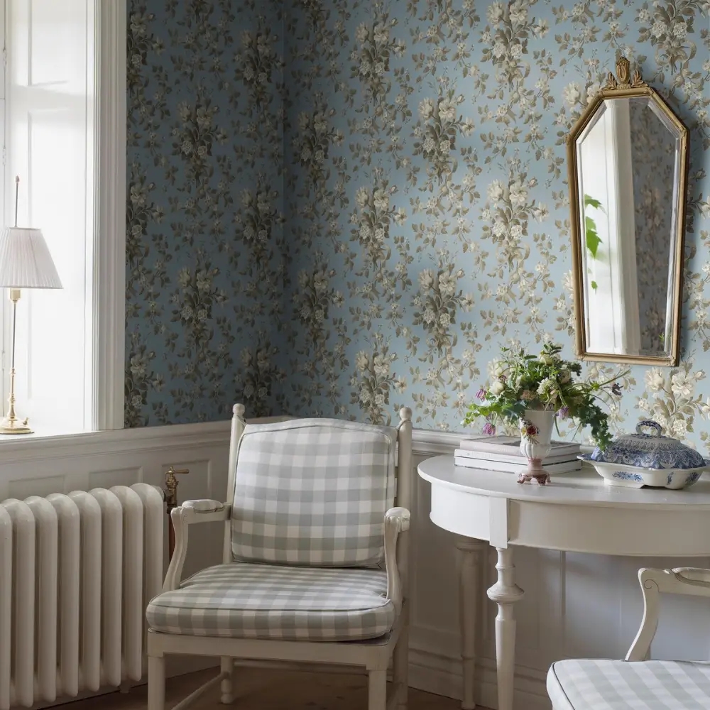 Her ses Tullgarn i originalens farveskala: beige og gråbrune blomsterbuketter på en himmelblå bund – en farvekombination, der også prydede slottets vindues- og dørkarme.