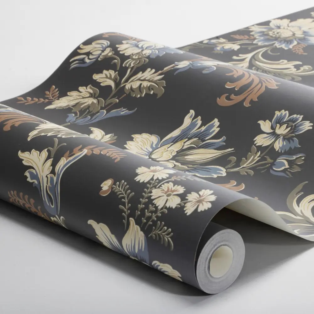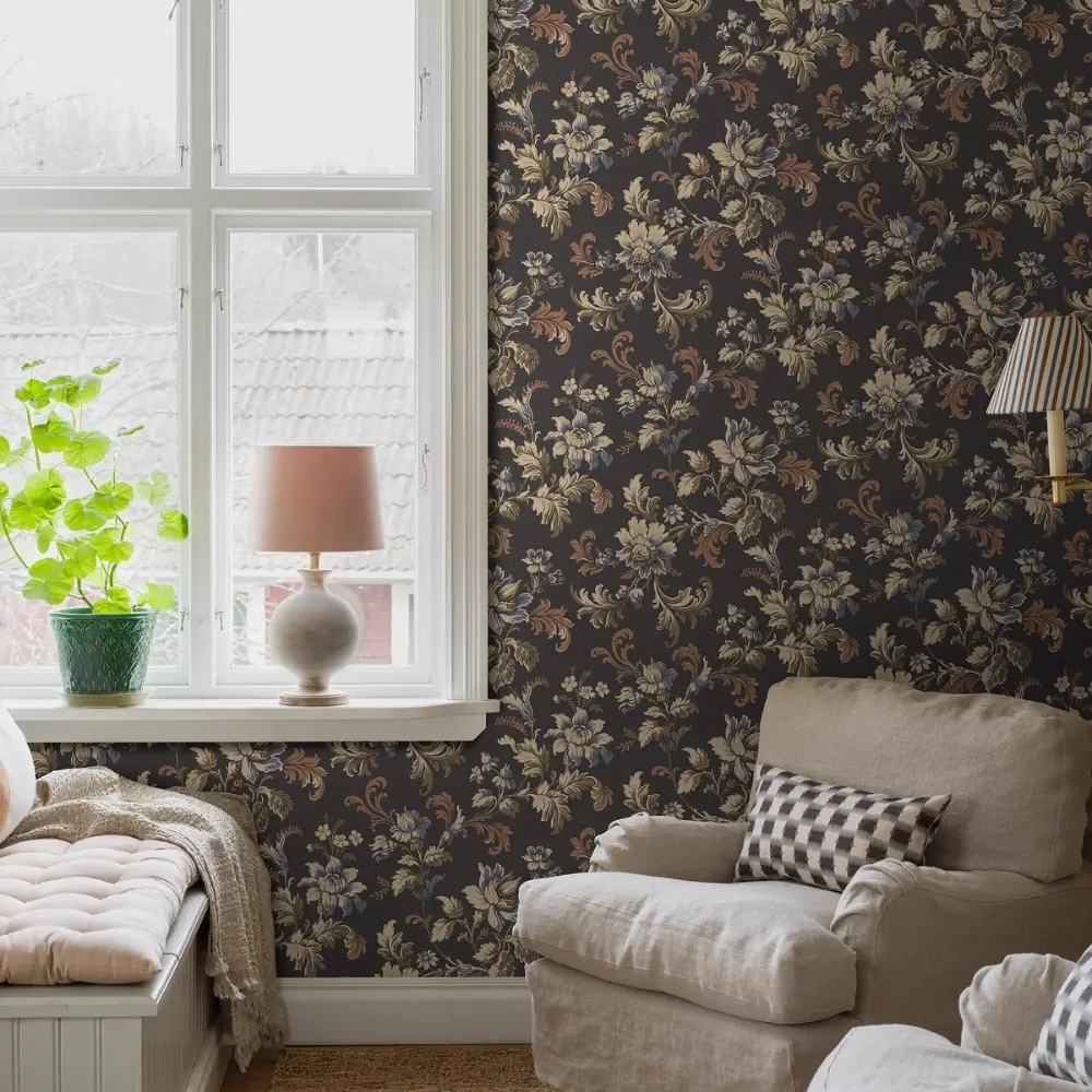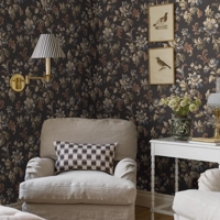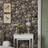 Her ses Elvira i en dramatisk mørk farveskala, hvor olivengrønne, brune og blå blomster står smukt mod en sort bund, krydret med fine gulddetaljer. Et stemningsfuldt tapet, der giver rummet dybde, elegance og et strejf af historisk drama.