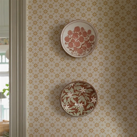 Her ses Stella i en varm og hyggelig farvesammensætning med okkergule stjerner på en natur/lys beige bund. Limtrykket giver tapetet en levende overflade med tydelig håndværkskarakter og et roligt, klassisk udtryk.
