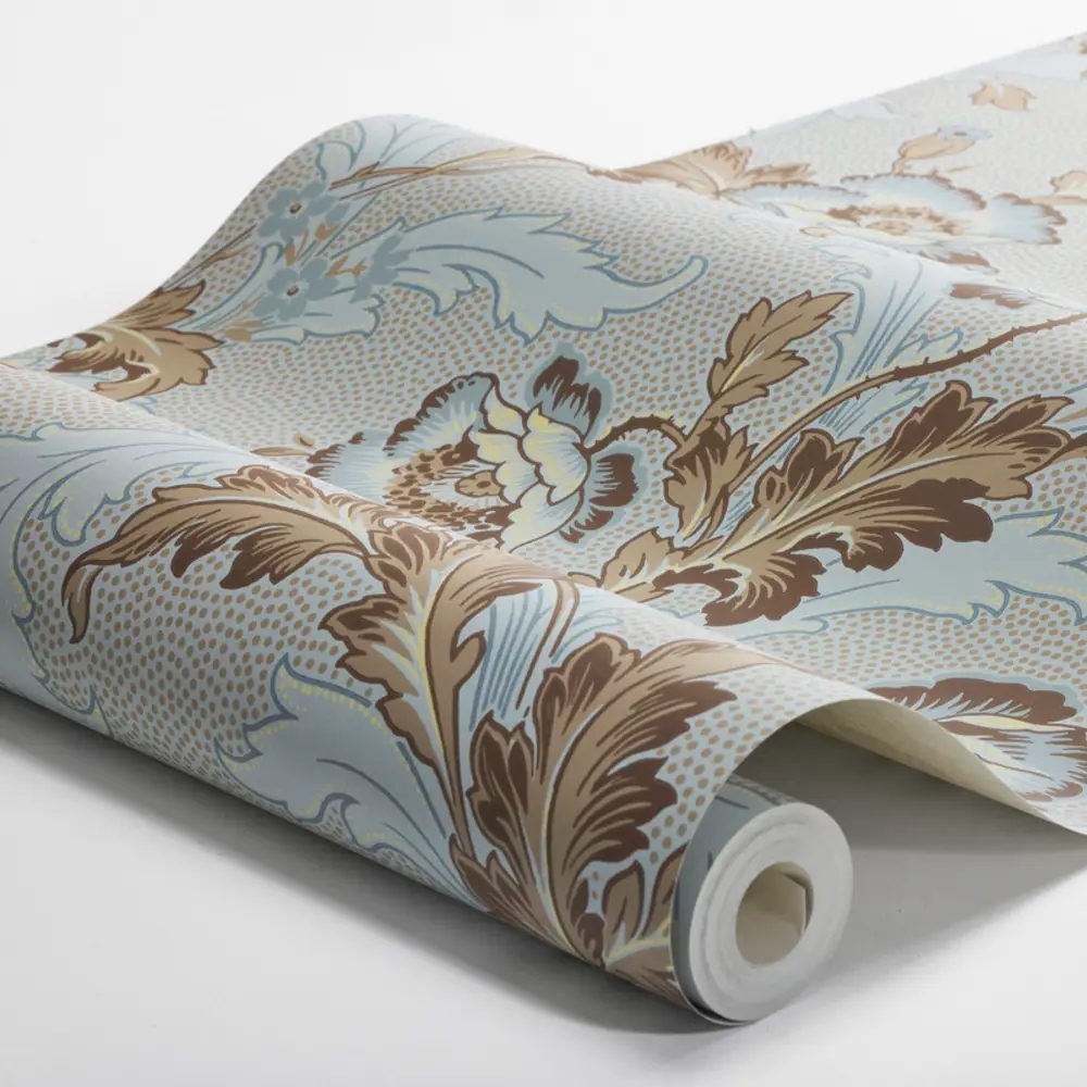 Göteborg er et storblomstret tapet fra 1890’erne, hvor statelige valmuer slynger sig over en fin prikmønstret bund. Mønsteret er bemærkelsesværdigt naturtro og rummer alle valmuens detaljer – fra de store, bløde kronblade til frøkapsler, fligede blade og de karakteristiske behårede stængler. Et klassisk botanisk design fra en tid, hvor naturmotiver dominerede tapetmoden.