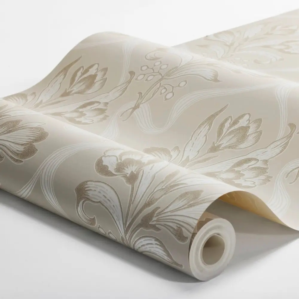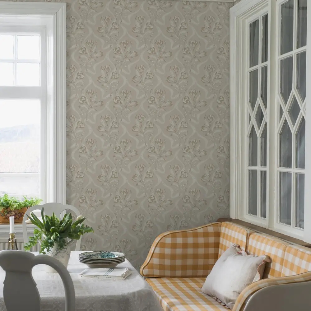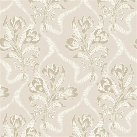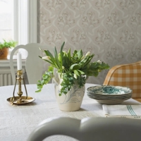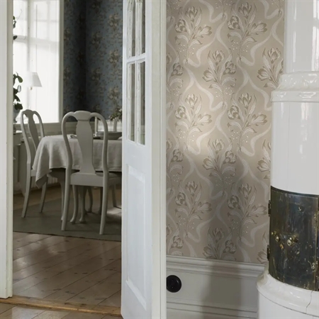 Her ses Jugendbukett i en blød, jordnær farveskala med varme toner af gråbrun og cremehvid på en varm gråbeige bund. De cremehvide detaljer har en smuk sølveffekt i det rette lys – et glimtende udtryk, som var populært i jugendperiodens tapetdesign.