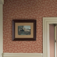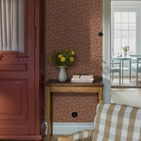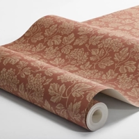 Her ses Hagtorn i et varmt rødt farveskema, hvor lyse beige detaljer står smukt mod en dyb, næsten rustfarvet bund. Et indbydende og stemningsfuldt tapet, der skaber varme og historisk charme i rummet.