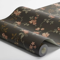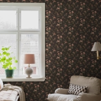 Her ses Värmdö i en dramatisk farvepalet, hvor de røde og rosa roser står smukt mod en mørkebrun, næsten sort baggrund. Det slyngende løv er i gråbrune nuancer med kobberglimt, som tilfører tapetet dybde og en smuk, levende effekt, når lyset rammer væggen.