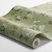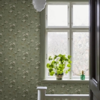 Her ses Värmdö i en naturlig og rolig farvesammensætning med hvide og beige roser i grågrønt og gulbrunt løv på en blød lindeblomstgrøn bund. Et behageligt og klassisk tapet, der giver rummet et lyst og harmonisk præg.