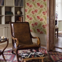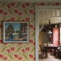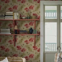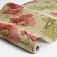 Vallmo er et storblomstret art nouveau-tapet fra begyndelsen af 1900-tallet, hvor naturens former og organiske linjer satte tonen i designet. Her ses den ikoniske valmue i dybe røde nuancer omgivet af gulgrønne, snørklede blade, knopper og frøkapsler. Baggrunden er sart beige med et strejf af gylden okker, som giver motivet varme og dybde.