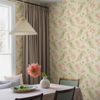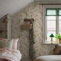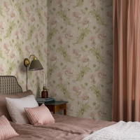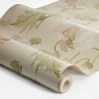 Her ses Vallmo i et romantisk farveudtryk med sartrosa blomster og lindeblomstgrønt løv, knopper og frøkapsler på en lys beige bund. Et venligt og harmonisk tapet, der skaber et blødt, klassisk udtryk i rummet.
