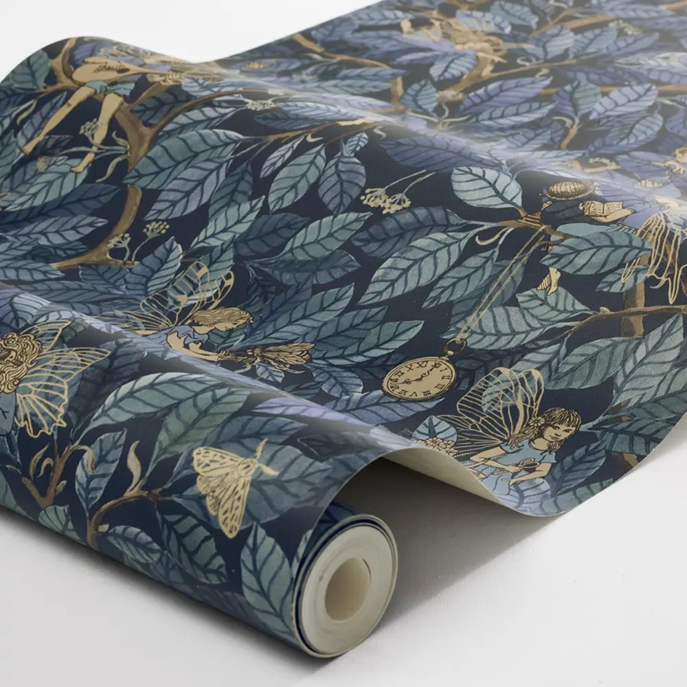 Her er Fairies-tapetet trykt i blå nuancer med gyldne detaljer på en midnatsblå bund – et roligt og drømmende valg til børneværelset.