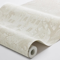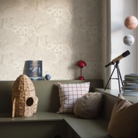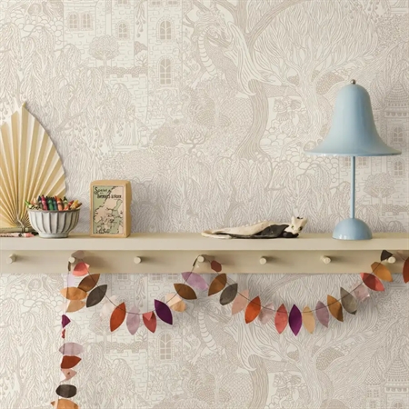 Kingdom of the Willow er håndtegnet og limtrykt i fine beige nuancer på en æggeskalshvid baggrund. Et lyst og roligt tapet, der indbyder til leg og skaber en tryg, drømmende stemning på børneværelset.