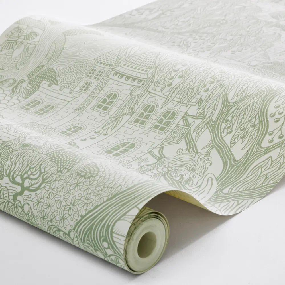 Børnetapetet Kingdom of the Willow er fyldt med små eventyr. Fra afstand anes slottet og det store piletræ – ser du nærmere, træder dragen, ridderen og prinsessen frem mellem grenene. Et mønster, der inviterer til leg og fantasi.
