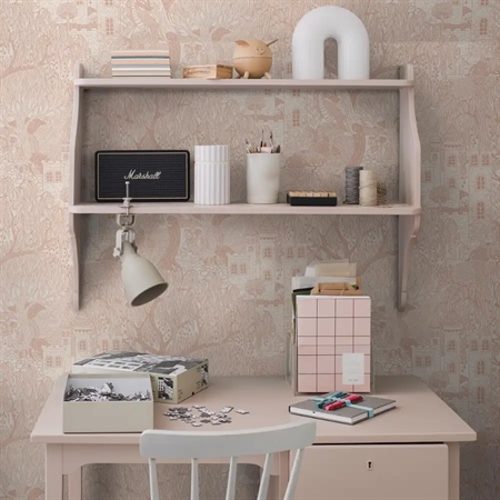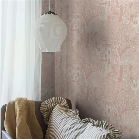 Mønstret er håndtegnet og limtrykt i en varm rosa nuance på en æggeskalshvid baggrund. Et lyst og roligt tapet, der skaber en tryg stemning på børneværelset.