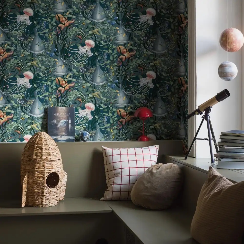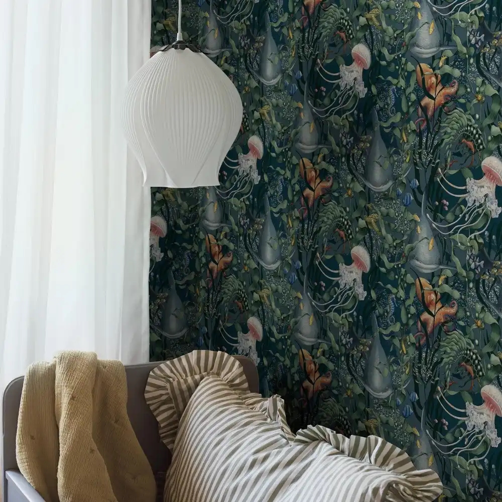Dyk ned i havets fortryllede verden med Underwater Magic. Mellem tang og koraller gemmer sig alt fra små fisk og søstjerner til hajer og skildpadder – et levende motiv, der vækker nysgerrighed og fantasi. Et stemningsfuldt tapet, der bringer havets ro og eventyr ind på børneværelset.