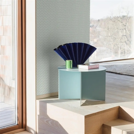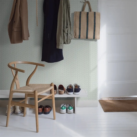 Ypsilon 1990 er et originalt design af Arne Jacobsen fra 1950’erne, her i en frisk kombination af blød turkis og hvid. Det bølgende mønster er enkelt og tidløst, hvilket giver en let og moderne atmosfære. Tapetet passer perfekt til stue, gang eller soveværelse, hvor du ønsker en skandinavisk æstetik med et frisk præg.