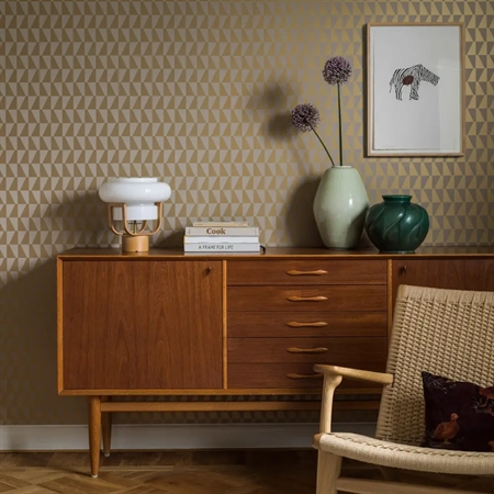 Trapez 1992 er et klassisk design af Arne Jacobsen fra 1950’erne, her i beige og skinnende guld. Det geometriske mønster skaber et moderne og iøjnefaldende udtryk, som giver rummet et eksklusivt præg. Tapetet er en favorit blandt stylister og arkitekter og passer perfekt i stue, spisestue eller soveværelse, hvor du ønsker et retroinspireret og tidløst design.