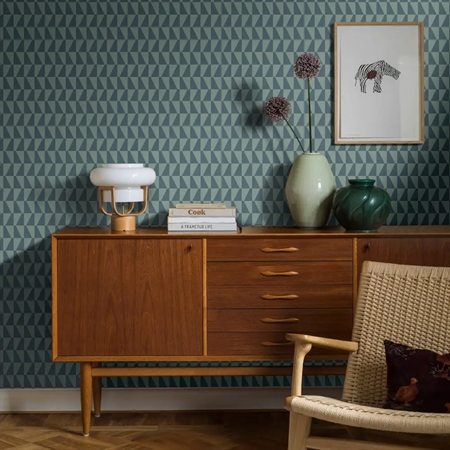 Trapez 1995 er et klassisk design af Arne Jacobsen fra midten af det 20. århundrede. Her fremstår det geometriske mønster i to nuancer af blå med en grøn undertone, hvilket giver et levende og sofistikeret udtryk. Tapetet passer perfekt til både stue og soveværelse – enten som en markant kontrastvæg eller på alle fire vægge for et fuldendt, moderne look.