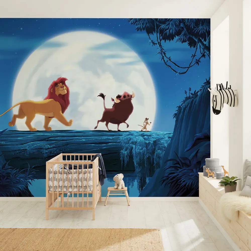 Pumba, Timon og Simba danser i måneskinnet i dette livlige og hjertevarme fototapet. Motivet symboliserer venskab, glæde og frihed – og bringer Disneys klassiske fortælling til live på børneværelsets vægge.