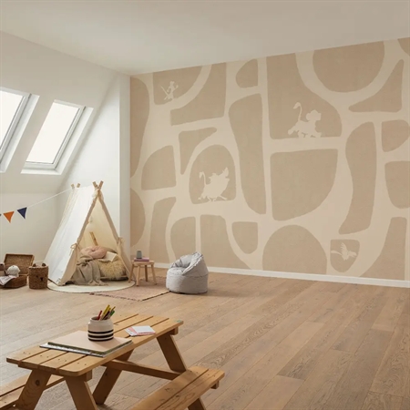 Et diskret og stilfuldt tapetdesign med bløde silhuetter af Pumba, Timon og Simba, der smelter harmonisk sammen med organiske former i beige og brune nuancer. Tapetet bringer et roligt og moderne udtryk til børneværelset – med et kærligt nik til Løvernes Konge.