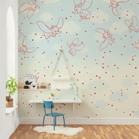Dumbo svæver let hen over væggen omgivet af blå skyer og røde prikker, der giver tapetet en livlig og magisk stemning. Et hjertevarmt motiv med klassisk Disney-charme – perfekt til baby- og børneværelser, hvor fantasien skal have luft under vingerne.