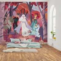 Anna, Elsa, Olaf, Kristoff og Sven står samlet foran en farverig efterårsskov i dette stemningsfulde fototapet. De varme nuancer og venlige udtryk lyser børneværelset op og bringer en følelse af fællesskab, eventyr og tryghed ind i rummet – perfekt til små fans af Disneys Frost-univers.
