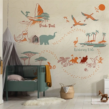 Dette Løvernes Konge-tapet kombinerer dueblå, rød og sennepsgul i et moderne og hyggeligt design. Motivet bringer varme og karakter til rummet og passer perfekt til både børneværelser og rum, hvor du ønsker et strejf af Disney-magi og afrikansk stemning.