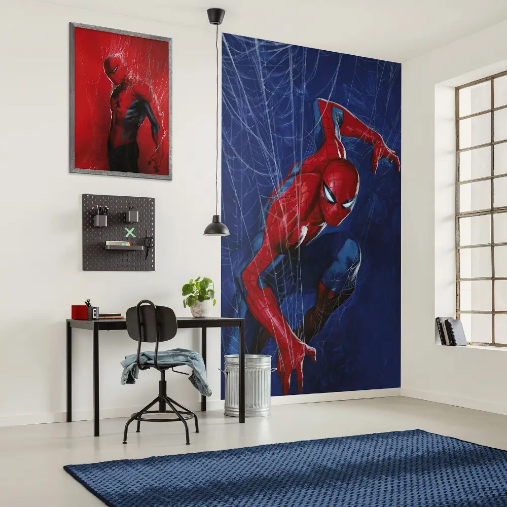 Spiderman svinger målrettet mod sin modstander i dette store portræt med et stilrent og grafisk udtryk. De minimalistiske farver og den dynamiske komposition fremhæver hans ikoniske karakter og giver tapetet et moderne og energisk look – perfekt til værelset hos både børn og voksne Marvel-fans.