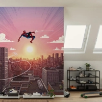 Spiderman svæver roligt over storbyen i solnedgangens skær – afslappet, men altid klar til at beskytte byen mod fare. Det varme lys og det ikoniske motiv skaber et stemningsfuldt tapet, der passer perfekt til børneværelser og teenageværelser med superhelte på væggene.